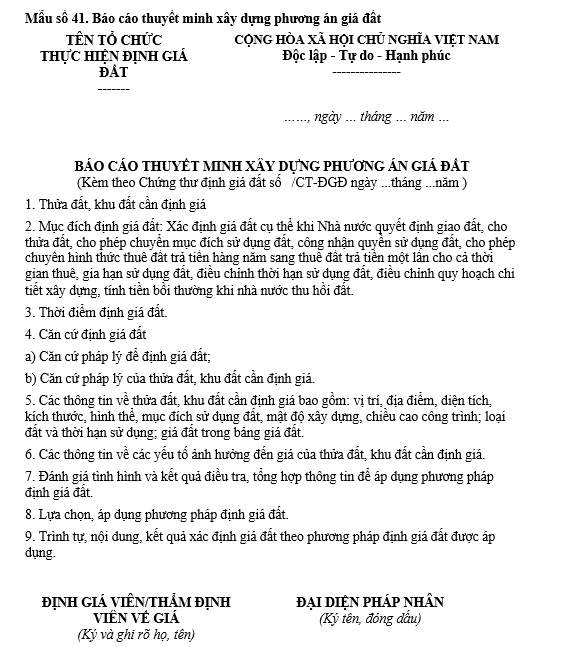 Mẫu báo cáo thuyết minh xây dựng phương án giá đất mới nhất hiện nay được quy định tại Mẫu số 41 của Phụ lục được ban hành kèm Nghị định số 151/2025/NĐ-CP, cụ thể như sau: