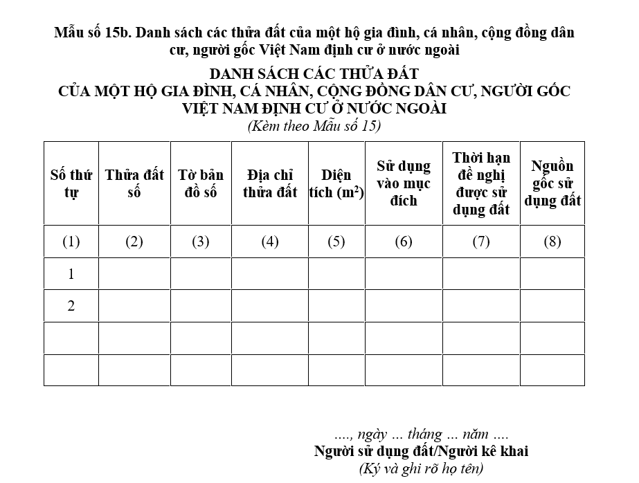 Mẫu danh sách các thửa đất của một hộ gia đình, cá nhân, cộng đồng dân cư mới nhất hiện nay được quy định tại Mẫu số 15b của Phụ lục được ban hành kèm Nghị định số 151/2025/NĐ-CP, cụ thể như sau: