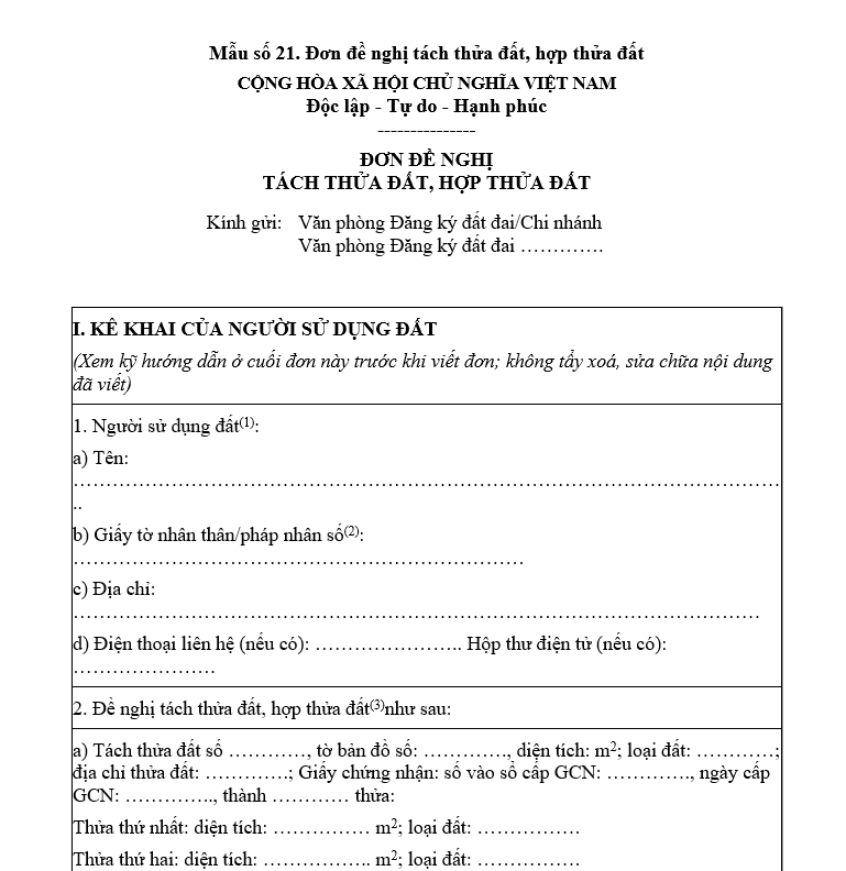Mẫu đơn đề nghị tách thửa đất, hợp thửa đất mới nhất hiện nay được quy định tại Mẫu số 21 của Phụ lục được ban hành kèm Nghị định số 151/2025/NĐ-CP, cụ thể như sau:
