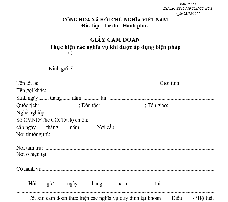 Mẫu giấy cam đoan thực hiện các nghĩa vụ khi được áp dụng biện pháp ngăn chặn (Bảo lĩnh, đặt tiền để bảo đảm, cấm đi khỏi nơi cư trú) căn cứ theo Biểu mẫu 84 Danh mục Biểu mẫu, giấy tờ, sổ sách về điều tra hình sự ban hành kèm theo Thông tư 119/2021/TT-BCA như sau: