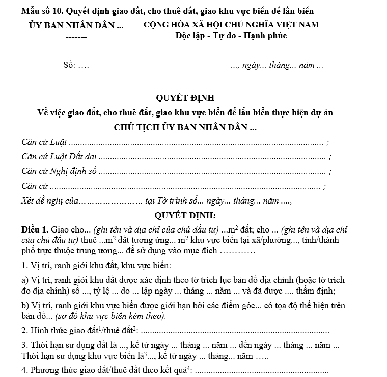 >> Tải về: Mẫu quyết định giao đất, cho thuê đất, giao khu vực biển để lấn biển