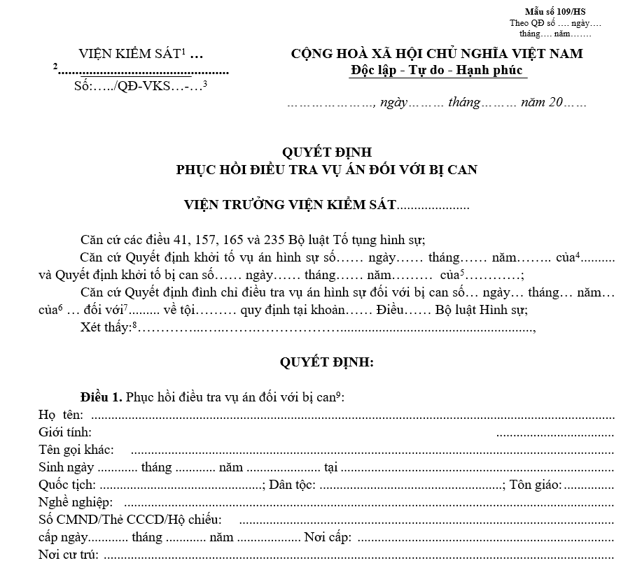 Hướng dẫn điền mẫu quyết định phục hồi điều tra vụ án đối với bị can