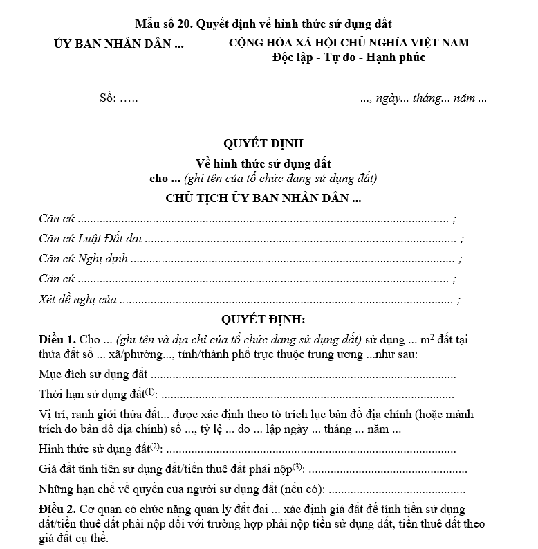 Hướng dẫn điền mẫu quyết định về hình thức sử dụng đất