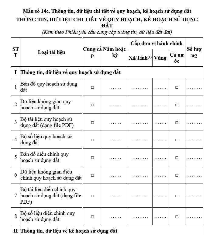 Mẫu thông tin, dữ liệu chi tiết về quy hoạch, kế hoạch sử dụng đất mới nhất hiện nay được quy định tại Mẫu số 14c của Phụ lục được ban hành kèm Nghị định số 151/2025/NĐ-CP, cụ thể như sau:
