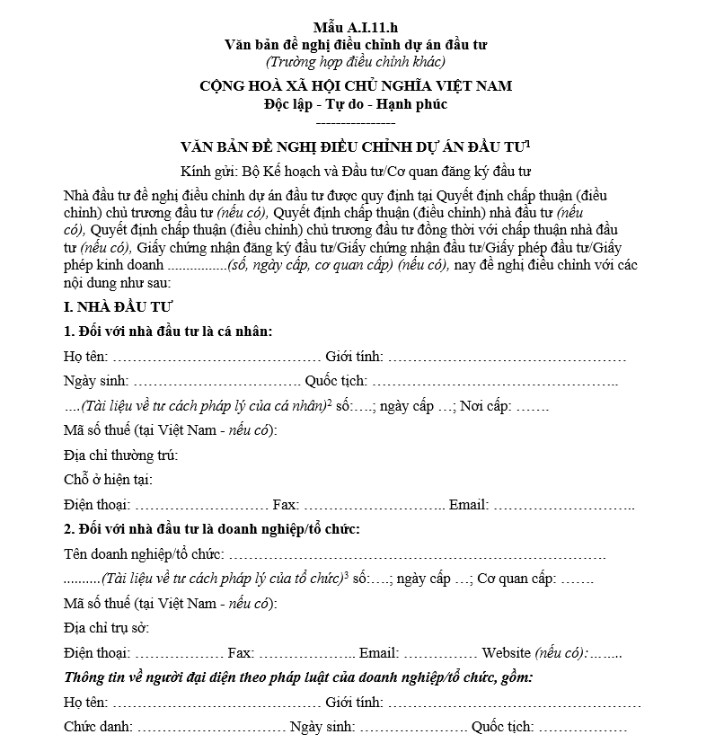Hướng dẫn điền mẫu văn bản đề nghị điều chỉnh dự án đầu tư (Trường hợp điều chỉnh khác)